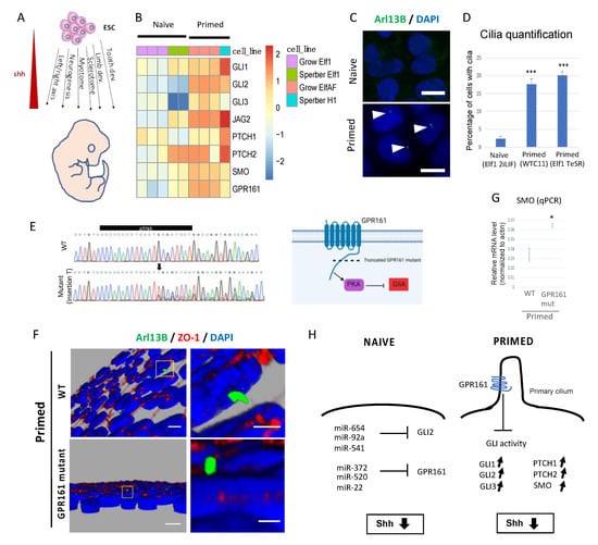 Interestingly, multiple components of the shh pathway are downregulated in naïve hESC compared to primed hESC, including GLI1, GLI3, PTCH1, PITCH2 and SMO (Figure 2B). The shh pathway is an important regulator of embryonic development (Figure 2A, [49]). However, despite the presence of functioning components in the primed state, the shh pathway seems to play only a minimal role in the maintenance of pluripotency [50]. Binding of Nanog to shh components has been proposed as one of the mechanisms to inhibit shh pathway in pluripotent cells [51]. Our data suggest that microRNAs could down-regulate the expression of the components of shh-signaling pathway in naïve hESC (Figure 2H). Furthermore, naïve, preimplantation mouse ESC do not contain cilia, the key mammalian cellular organelle for Hh signaling. However, this organelle is found in the post-implantation stage [52,53,54]. To test the presence of cilia in human naïve-to-primed hESC transition we stained naïve and primed hESC with ARL13B. Importantly, we observed a significant increase in cilia number between these two stages (20-fold increase between naïve and primed hESC; (Figure 2C,D). These data argue that cilia morphogenesis occurs in naïve-to-primed hESC transition, licensing primed hESC for Hh pathway activity. It is therefore perhaps even more surprising that the Hh pathway is not active in the primed hESC stage. Through a whole genome CRISPR screen we found that GPR161, a ciliary G-protein coupled receptor, is required for the naïve to primed transition in hESC [55]. GPR161 is up-regulated in primed hESC (Figure 2B) and some of the microRNA predicted to target GPR161 (miR-372, miR-520, and miR-22) are down-regulated in primed compared to naive hESC [22,27]. GPR161 can negatively regulate the shh pathway [56], hence it could explain why the Hh-pathway is not active in primed hESC despite the presence of cilia and up-regulation of Hh-pathway components (Figure 2H). To test this hypothesis, we generated a GPR161 mutant hESC line using CRISPR Cas9 (Figure 2E–G). Most of the cells from the GPR161 mutant line express a GPR161 protein with a truncated C terminus due to the insertion of one nucleotide, resulting in a frameshift at residue 392 and the introduction of a premature STOP codon in position 426 (Figure 2E). The missing region in the truncated mutant line has been shown to be essential for GPR161 function and regulation of PKA and shh [57,58]. The mutant GPR161 hESC line exhibits primary cilia (Figure 2F) and one of the shh components, SMO, is up-regulated in GPR161 mutant hESCs compared to controls (Figure 2G). These data suggest that lack of GPR161 may induce promiscuous Hh pathway activity in hESCs. We propose that GPR161 is required for repressing the Hh pathway in the primed hESC stage (Figure 2H).