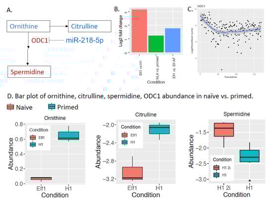 We further integrated microRNA expression, mRNA expression, and metabolomics data, and found consistent changes across three datasets in the polyamine metabolic pathway (Figure 3). ODC1 (ornithine decarboxylase) is a rate-limiting step in polyamine metabolism, and is significantly up-regulated in naïve hESCs. miR-218-5p, which targets ODC1, is down-regulated in naïve hESCs. Additionally, the substrate of ODC1, ornithine, is significantly depleted in naïve hESCs based on our metabolomics data. Spermidine, a key product of polyamine synthesis, is more abundant in naïve hESCs. Consistent with the conversion of ornithine to spermidine, the alternative route of ornithine catabolism, citrulline, is less abundant in naïve hESCs. Other enzymes or metabolites in the polyamine pathway did not change, possibly because some enzymes are regulated at the translational level, not transcriptional level (e.g., AMD1) [67]. ODC1 has been shown to be essential for mouse ESC self-renewal [68], and high polyamine (e.g., spermidine) levels have been shown to promote mouse ESC self-renewal [69]. Our analysis suggests that ODC1 and spermidine may also promote human naïve pluripotency, and down-regulation of miR-218-5p may be important for maintaining high polyamine metabolism in naïve hESCs. miR-218-5p has been widely studied in cancer [70].