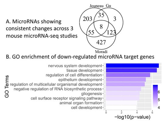 microRNAs regulating mouse naïve to primed ESCs transition: (A) Venn diagram of microRNAs changing in the same direction in naïve to primed transition across three microRNA-seq studies of mouse ESC vs. mouse EpiSC. (B) Gene ontology enrichment of microRNA target genes with lower expression in mouse ESCs (the microRNA regulators are higher in naïve). The x-axis is the negative log10 of enrichment p-value (larger means more significant).