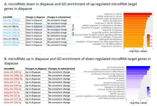 The transition from pre-to-post-implantation can be suspended in an intermediate state called diapause. To obtain a more complete picture of microRNAs potentially involved in regulating the diapause state, we combined a publicly available microarray-based profiling of diapause and re-activated embryos [37] with our RNA-seq of diapause and post-implantation embryos [35], using the strategy outlined in Figure 1A. We identified 379 consistent connections between 38 microRNA and 274 target genes, where a microRNA is up (down)-regulated, and its target gene is down (up)-regulated (Table S7). We compared target genes up-regulated in diapause (their microRNA regulators down in diapause) against all up-regulated genes in diapause, and found that these microRNA target genes show more enrichment in stress response (e.g., EGR1) [82], hypoxia (BACH1) [83], and hormone response (e.g., ZBTB7A) [84] pathways, which is consistent with the diapause phenotype (Figure 5A). On the other hand, target genes down-regulated in diapause (their microRNAs up-regulated in diapause) showed enrichment in cellular morphogenesis, differentiation, and development (Figure 5B), which is consistent with diapause as a suspended state in developmental progression.