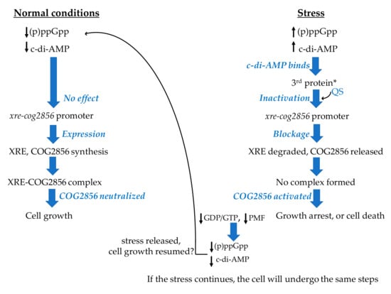 Regulation of the TA modules is connected to cellular signaling pathways []. Cell signaling molecules, such as the (p)ppGpp (guanosine tetra or pentaphosphate, known as the alarmones [], play a vital role in the regulation of the transcription and translation of TA modules, and thus bacterial physiology []. The (p)ppGpp is a global regulatory signal in bacteria, induced by nutrient-starvation and, in turn, activates the toxin by activating proteases that degrade the antitoxin [,] (the (p)ppGpp role is discussed further in Section 2.8.1). The opposite seems to also be possible for some toxins depending on their mechanism of action, as Álamo et al. have shown that in Bacillus subtilis, the type II toxin ξ, an ATPase, hydrolyzed the ATP, converted the GTP to (p)ppGpp, and raised the levels of the second messenger, the cyclic-di-adenosine monophosphate (c-di-AMP) []. Quorum-sensing signal molecules may also be involved in activating the type II toxins, as discussed further below.