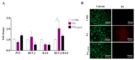 Determination of cell apoptosis using RT-qPCR (A) and calceinacetoxymethyl (AM) / propidium iodine (PI) double staining (B). Apoptosis was evaluated by analysis of apoptosis-related genes expression. Results are expressed as mean ± SD. Statistical significance is indicated as an asterisk (*): * p < 0.05, using a one-way ANOVA (and nonparametric) test. (B) Representative images of calcein-AM (green) and PI (red) staining. The images were taken using an epifluorescence microscope.