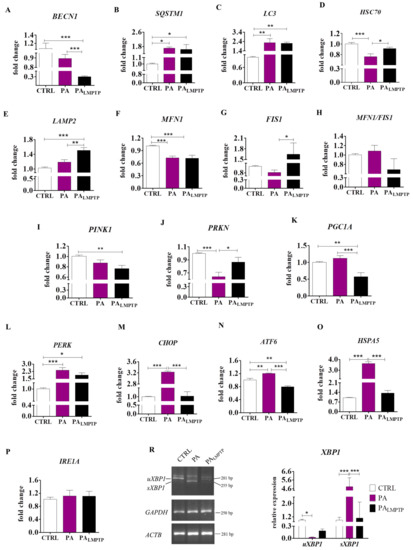 Lipotoxicity and IR in insulin-sensitive tissues correspond with impaired autophagy and mitochondrial dynamics, as well as excessive ER stress. Therefore, we sought to identify the role of LMPTP inhibition on the expression of autophagy-related genes using RT-qPCR. We observed that LMPTP inhibition significantly reduced the mRNA level of BECN1 (p < 0.001) (Figure 3A), whereas it did not affect expression of SQSTM1 (Figure 3B) and LC3 (Figure 3C) compared to the PA group. In addition, it markedly enhanced the expression of genes involved in chaperone-mediated autophagy (CMA), such as HSC70 (Figure 3D) and LAMP2 (Figure 3E), in comparison with the PA-induced IR group (p < 0.05, p < 0.01 and p < 0.01, respectively). The upregulation of autophagy-related genes suggests that LMPTP inhibition may help to re-establish cellular homeostasis. An imbalance in the mitochondria fusion/fission ratio is highly linked to mitochondria dysfunction and IR [6]. We found that LMPTP inhibition enhanced mRNA levels of FIS1 (p < 0.05) (Figure 3G); however, it did not alter the expression of MFN1 (Figure 3F) or the MFN1/FIS1 ratio (Figure 3H) when compared to the PA group. Mitofusin encoded by the MFN1 gene promotes mitochondrial fusion, whereas mitochondrial fission 1 (FIS1) is involved in mitochondria fission [27]. Importantly, LMPTP inhibitor promoted expression of PRKN (Figure 3J), whereas it did not affect the expression of PINK1 (Figure 3I). Both genes positively regulate mitophagy, which is involved in selective removal of damaged mitochondria and thus participates in mitochondria quality control [28]. In contrast, the result showed that LMPTP inhibitor induced a significant decrease of PGC1A transcript levels in comparison to the CTRL and PA groups (p < 0.01 and p < 0.001, respectively) (Figure 3K). In addition, we examined the effect of LMPTP inhibition on the expression of genes involved in the unfolded protein response (UPR). UPR is a regulatory system activated in response to excessive accumulation of unfolded or misfolded proteins in the ER lumen, while its prolonged activation promotes cell apoptosis [29]. We found that LMPTP inhibition diminished expression of CHOP (Figure 3M), ATF6 (Figure 3N), and HSPA5 (Figure 3O) when compared to the PA group (p < 0.001). What is more, it did not affect the transcript levels of PERK (Figure 3L) and IRE1A (Figure 3P), whereas it downregulated XBP1 splicing (Figure 3R). RT-PCR analysis showed that 24 h of exposure of HPCs to PA significantly enhanced the levels of the spliced form of x-box binding protein (sXBP1) when compared to the control untreated group (p < 0.001). In contrast, LMPTP inhibition significantly reduced transcript levels of sXBP1 (255 bp) (p < 0.001) (Figure 3R). Decreased splicing of XBP1 after LMPTP inhibition indicates increased IRE1α endonuclease activity. The upregulation of mitophagy-related genes along with downregulation of UPR-related genes observed during LMPTP inhibition indicates its role in the modulation and maintenance of metabolic homeostasis.