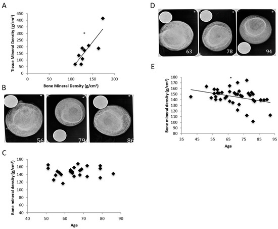 Tissue mineral density (TMD) measurements were calculated in order to determine and validate the bone mineral density (BMD) measurements and the corresponding trends observed with the BMD measurements. (A) A positive correlation was observed when comparing the microcomputed tomography (microCT) TMD measurements to the BMD measurements. Femoral necks of a total of 10 randomized patients diagnosed with osteoporosis (POP) were scanned through microCT in order to generate the computed TMD measurements. These measurements were then directly compared with the corresponding BMD measurements in order to validate any potential trends seen with BMD and age. (B) X-ray images of three femoral heads extracted from patients diagnosed with osteoarthritis (POA). All patients were female (age is labeled). X-rays were taken down the midsagittal plane, with a penny used to verify consistency in distance between the handheld X-ray (Nomad Pro Handheld X-ray system) and specimen. (C) We used single-photon absorptiometry (SPA), which utilizes a single-energy photon beam that passes through the bone to a detector, in order to quantify patients’ respective BMD. Femoral heads of 25 female POA were X-rayed, and their BMD was quantified. The data was then plotted and compared to increasing age, and trends were observed. (D) Radiographs of the extracted femoral heads of three female POP (age is labeled). The X-rays were taken down the midsagittal plane, with a penny used to determine the distance between the X-ray machine and femoral head. (E) The extracted femoral heads were X-rayed, and their BMD was quantified using SPA. All specimens were extracted from female patients, and 42 X-rays were quantified in total. * denotes significant correlation (p < 0.05).