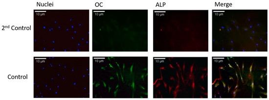 Most studies in the bone biology field have used human primary MSCs rather than mature bone cells. This is because MSCs are extremely easy to isolate and grow. They also have a faster doubling time and thus a faster experimental turnaround time. However, there are some caveats to using MSCs. Because they are being grown and differentiated in vitro, there could be some discrepancies between how the cells react in culture versus how they would have reacted in vivo. Isolating and extracting mature osteoblasts is extremely time-consuming and difficult; however, working with mature osteoblasts is more rewarding. It is more indicative of osteoblasts’ response in vivo. In order to confirm that mature osteoblasts could be isolated from human femoral heads, the isolated cells were stained fluorescently for two osteoblast markers: alkaline phosphatase (ALP) and osteocalcin (OC). ALP is an early-stage osteoblast marker, and OC is a late-stage osteoblast marker. Unstimulated cells were stained positive for both markers (except the negative controls, i.e., 2nd control), as can be seen in Figure 2. This confirmed that approximately 90% or more positively stained cells were osteoblasts and that mature osteoblasts could be isolated from the femoral heads.