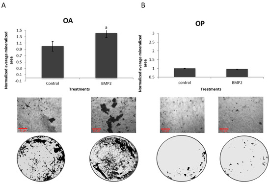 Cells isolated from POP did not respond to BMP2 stimulation, while POA did. (A) Five female patients were analyzed. Cells from all patients responded significantly to BMP2 compared to unstimulated cells. (B) Five other female patients diagnosed with osteoporosis were analyzed, and their cells showed no mineralization response compared to unstimulated cells (p < 0.05). a = statistically significant from control.