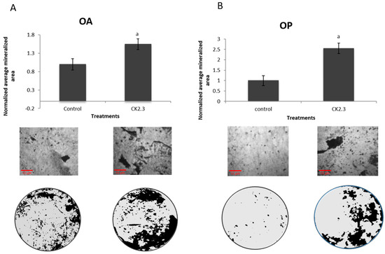 Cells isolated from both POA and POP responded to CK2.3 stimulation. (A) Cells from five female POA were analyzed, and significantly responded to CK2.3 stimulation compared to unstimulated or control cells. (B) Cells extracted from five female POP were analyzed, and all patients significantly responded to CK2.3 treatment compared to the control. CK2.3 could be a potential therapeutic product for osteoporosis (p < 0.05). a = statistically significant from control.