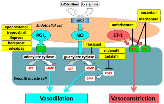 Modern development of drugs for PAH focus on three pathways, namely the prostacyclin (prostaglandin I2) (PGI2), nitric oxide (NO), and endothelin pathways [,]. Impaired production of vasodilators such as PGI2 and NO, along with over-expression of vasoconstrictors such as endothelin-1 are critical for the pathogenesis and progression of PAH. Drugs targeting the three pathways, including prostacyclin (PGI2), endothelin receptor antagonists (ERAs), phosphodiesterase type-5 (PDE5) inhibitors, and a soluble guanylate cyclase (sGC) stimulator, are currently available and have been shown to be effective (Figure 1) [,,,,,].