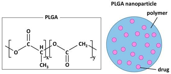 Nano-DDS can be composed of a variety of materials and structures, including micelles, liposomes, dendrimers, and polymers [,]. Polymeric nanospheres are formed by the assembly of macromolecular polymers and can contain hydrophilic and hydrophobic therapeutic agents. Two polymers, polylactide (PLA) and poly (lactide-co-glycolic acid) (PLGA), are used for the synthesis of FDA-approved polymeric biodegradable nano-DDS (Figure 2) [].