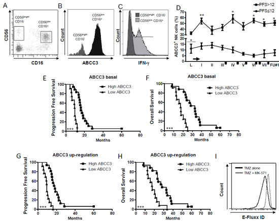 ABCC3 expressed by CD56dim CD16+ NK cells is an indicator of better patient prognosis. (A–C). (A) Representative dot plots showing that CD56dim CD16+ NK cells express (B) high levels of ABCC3, (C) and CD56dim CD16+ ABCC3+ NK cells express IFN-γ. (D) Time course of frequency of NK cells expressing ABCC3 measured by flow cytometry (* p < 0.01, ** p < 0.005, vs. leukapheresis; underlined asterisk PFS > 12 vs. PFS ≤ 12). The arrow represents the standard Stupp protocol [3] after leukapheresis, before the first vaccination (indicated as I), and the black rectangles correspond to the TMZ administration as maintenance. (E,F) Kaplan–Meier survival curves showing the positive correlation between high basal ABCC3 expression in NK cells with (E) PFS and (F) OS. (G,H) Kaplan–Meier survival curves showing the positive correlation between ABCC3 upregulation during treatment with chemoimmunotherapy and better (G) PFS and (H) OS, (*** p < 0.001). (I). Flow cytometry displaying the multidrug resistance activity of NK cells treated in vitro with TMZ with or without the efflux inhibitor MK-571. Cells showing drug resistance have a MAF greater than 25%.