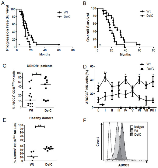 DelC genetic variant is related to a better response to chemoimmunotherapy. (A,B) Kaplan–Meier survival curves showing the correlation between DelC SNP and a good outcome, expressed as (A) PFS and (B) OS (DelC patients, n = 14, Wt patients, n = 16). (C) Scatter dot plots showing the frequency of NK cells expressing ABCC3 in a total of 23 patients (Wt or DelC), at the time of leukapheresis (L). (D) Time course of NK cells expressing ABCC3 measured by flow cytometry in DENDR1 patients carrying DelC compared to Wt. (E,F). (E) Scatter dot plots showing the frequency of NK cells expressing ABCC3 in 13 healthy donors divided in Wt (n = 6) and DelC (n = 7). (F) Representative histogram overlays for flow-cytometric analysis of ABCC3 expression on NK cells from healthy donors. The isotype control is represented as white histogram plot. The specific fluorescent signals are shown in light grey for Wt donors and dark grey for DelC donors.