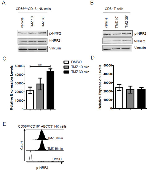 (A,B) Representative western blot analysis performed on enriched (A) NK and (B) CD8+ T cells from donor PBLs showing that 25 μM of TMZ increased the activation of NRF2 (phosphoSer40) after 30 min of treatment. Vinculin was used as loading control. The immunoblot is representative of three experiments. (C,D) Densitometric quantification of p-NRF2 expression in NK cells and CD8+ T cells treated with DMSO or TMZ at two different time points. Data are presented as mean ± SD of three independent experiments at the two different time points (p = 0.004). (E). Flow cytometry stacked histograms showing intracellular staining of p-NRF2 in donor-derived CD56dim CD16+ ABCC3+. The DMSO treatment is represented as light grey histogram plot. The activation of NRF2 at 10 and 30 min is displayed in dark grey and black, respectively.
