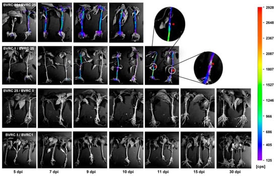 Plant colonization by BL-Rs7 was determined by bioluminescence imaging using a Berthold NightSHADE CCD camera, model LB985 (Berthold Technologies GmbH & Co. KG, Bad Wildbad, Germany). Bioluminescence images were acquired as described previously [1,67]. The imaging parameters of the sensitivity/resolution setup were 4 × 4 binning and a 5 min delay in the dark imaging chamber prior to an incremental exposure time of 180 s. After imaging, the plants were replanted into the pots and placed in the growth chamber. Root-inoculated seedlings were imaged at 5, 7, 9, 10, 11, 15, and 30 dpi to monitor the movement of bacteria. The bioluminescence signal in planta was quantified using indiGo software, and the light intensity was displayed in counts per second.