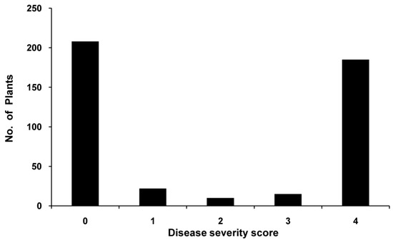 Histograms of the disease severity scores (ranging from 0 = asymptomatic to 4 = dead) of the F2 population (n = 440) in response to root-dip inoculation with R. solanacearum strain Rs-SY1 at 20 days post-inoculation.