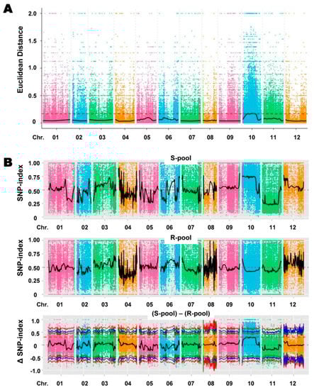 where Maa indicates the depth of the aa population derived from M; Paa indicates the depth of the aa population derived from P; Mac indicates the depth of the ac population derived from M; Pac indicates the depth of the ac population derived from P. Δ(SNP index) = 1 if the bulked DNA comprise only the parent BVRC 1; Δ(SNP index) = −1 if it comprised only the parent BVRC 25; Δ(SNP index) = 0 if the bulked DNA has the same SNP index as both parents in the genome region. The average SNP index was plotted against the position of each sliding window (4 Mb) in the CM334 genome. The Δ(SNP index) data were then fitted using LOESS regression, and the threshold for the significance of marker–trait associations was set at 1% of the largest Loess-fitted values [26]. The regions for which Δ(SNP index) values exceeded the threshold were considered candidate regions (potential QTLs) associated with resistance to BW. Finally, ED, SNP index, and ΔSNP index values were plotted, and the intersections between candidate regions identified using the ED and SNP index methods were designated as final candidate BW resistance associated regions.