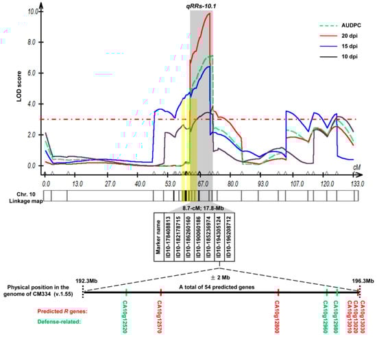 Composite interval mapping (CIM) was used to identify BW resistance QTL(s) based on four resistance components, including DSI at 10, 15, and 20 dpi, and the AUDPC values (Figure 4). A significant QTL with a log-likelihood (LOD) score of more than 3.0 was detected on chromosome 10 as early as 10 dpi. QTL mapping based on the DSI value at 15 dpi revealed a large regional and significant QTL region that covered the two associated regions identified by SLAF-BSA. Based on the DSI at 20 dpi, the QTL reached a maximum plateau LOD score of 9.79 and accounted for 19.01% of the phenotypic variation. The significant QTLs involved in each resistance component were mapped to similar genome regions. Although the position of the QTL peak varied, the intervals overlapped for DSI at 15 and 20 dpi, and AUDPC, and this QTL was considered the major QTL for BW resistance in the pepper line BVRC 1 (Figure 4). The overlapping QTL region (designated “qRRs-10.1”) was mapped at 63.6–72.3 cm—an interval of 8.7 cm—between two InDel markers (ID10-178408813 and ID10-196208712) that were physically located in the region of 178.4–196.2 Mb (~17.8 Mb) on chromosome 10. Genetic mapping information of the QTL regional markers is provided in Table 3. Seven InDel markers were located within the major QTL qRRs-10.1, and ID10-194305124 was the closest to the QTL peak. Moreover, based on significant marker effects in the F2 population, ID10-194305124 showed the strongest correlation with R. solanacearum resistance when compared with the other markers, as F2 plants harboring the resistance allele of ID-194305124 showed the lowest mean AUDPC (6.36), and those harboring the susceptibility allele showed the highest AUDPC (35.52) (Table 3). The additive effect of the associated markers indicated that the BW resistance-increasing allele was contributed by the resistant parent BVRC1. The DR was 0.2–0.8 for all seven significant markers, indicating partial dominance of qRRs-10.1. Using the package R/qtl, it was verified that only one significant QTL peak existed on chromosome 10, and markers ID10-194305124 and ID10-196208712 were located the closest to the QTL peak (Figure S4). Thus, SLAF-BSA combined with QTL mapping identified a major BW resistance QTL, qRRs-10.1, on chromosome 10 of the pepper line BVRC 1.