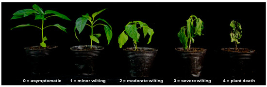 At 7, 10, 15, and 20 dpi, the disease severity of each plant was scored as follows: 0 = asymptomatic; 1 = minor symptoms with less than 20% wilted leaves; 2 = moderate symptoms with 20–50% wilted leaves; 3 = severe symptoms with 50–80% wilted leaves; 4 = dead plant, 80–100% wilted leaves (Figure 5). The DSI was calculated as follows: