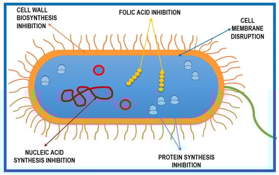 Antimicrobial agents have been used since at least 2000 years ago, when the Ancient Egyptians and Greeks used different plant extracts and mold to treat infections [2]. Since the well-known discovery of penicillin by Alexander Fleming in 1928 through to modern days, antibiotics have been among the most commonly used drugs for treating pathogen infections [3]. Since the number of new classes of antibiotics has decreased and no new classes have been discovered since daptomycin and linezolid in the 1980s, optimizations of already-existing molecules or combinations of different compounds are used for new commercialized products [4]. Figure 1 presents a schematic representation of the mechanisms of action traditionally targeted by antibiotics: (1) disruption of the cell membrane, (2) inhibition of nucleic acid synthesis (DNA/RNA), (3) inhibition of protein synthesis by acting on ribosomes, (4) regulation of enzymes involved in cell wall biosynthesis, and (5) inhibition of folic acid synthesis in the cytoplasm. A modern approach in order to combat antimicrobial resistance would be finding newer targets or using alternative antimicrobials, either natural or synthetic compounds [5,6].