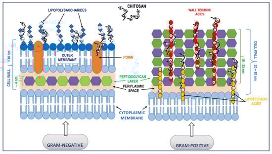 Often, bacteria need to survive even in the most hostile environments; therefore, they developed a specialized cell envelope that is selectively permeable and protects the cell. The antimicrobial effect of chitosan on prokaryotic bacterial cells depends on the electrostatic interactions between this polymer and negatively charged components in the bacterial cell wall (Figure 2).