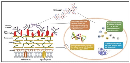 As many studies show, chitosan can inhibit bacterial cell growth and even kill them, but regarding yeast cells, only high concentrations of chitosan can have an antifungal effect and inhibit yeast cells growth [71,87,115,116]. Since chitosan’s cationic nature is the result of the presence of reactive amino groups in its structure, if these groups are blocked, antimycotic activity will be severely reduced [117]. The fungal cell wall is a unique structure, and its components are glycoproteins and polysaccharides, mainly glucan and chitin. These structures are strongly cross-linked to form a resistant assembly that will protect the fungal cell from environmental stress but at the same time will allow the fungal cell to interact with its environment.