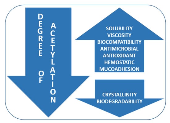 The molecular weight and degree of acetylation of chitosan define several properties of this polymer [148]. The molecular weight of chitosan has a great influence on its biomedical properties. Moreover, the degree of acetylation strongly influences its antimicrobial properties by increasing its solubility and its positive charge. As shown in Figure 4, some physico-chemical properties such as solubility, viscosity, and biocompatibility increase once the DA decreases, while crystallinity and biodegradability are directly proportional to the DA. Biological properties such as antimicrobial, analgesic, antioxidant, hemostatic, and mucoadhesive abilities increase once the degree of acetylation is lower [149].