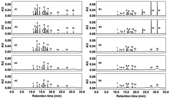 The digestive stability of these flavonol glycosides and aglycones in more complex mixtures, namely FLG and FLA from green tea, were investigated. The content of kaempferol, myricetin, and quercetin was 5.91, 4.15, and 7.72 mg/g for FLG and 34.71, 15.94, and 38.21 mg/g for FLA, respectively, in our previous research []. The phenolic compounds identified in FLG and FLA are summarized in Table 2. The digestive changes of flavonol glycosides and aglycones in FLG and FLA are depicted in Figure 1 with numbered peaks (1–16). The 16 phenolic glycosides and aglycones were identified in our previous high-resolution mass analysis study [].