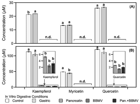 Changes of flavonol aglycones (kaempferol (16), myricetin (14), and quercetin (15)) in (A) FLG and (B) FLA after in vitro digestion. Different lowercase letters on the bars of each aglycone represent significant differences according to the Tukey–Kramer honest significant difference test (p < 0.05). Pan.+BBMV: co-treatment with pancreatin and BBMV. n.d.: not detected.