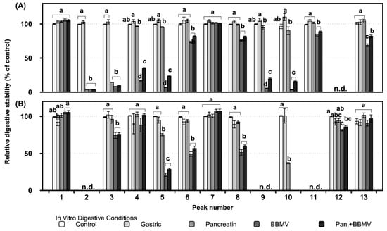 Changes of glycosides in (A) FLG and (B) FLA after in vitro digestion. Different lowercase letters on the bars of each compound (peak number) represent significant differences according to the Tukey–Kramer honest significant difference test (p < 0.05). Pan.+BBMV: co-treatment with pancreatin and BBMV. n.d.: not detected. Refer to the peak number in Figure 1.