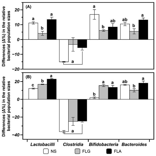 Effects of FLG and FLA on the microbial population in an in vitro fecal fermentation for (A) 12 h and (B) 24 h. Differences (Δ%) in the relative bacterial population sizes with respect to the total number of bacteria were evaluated after fermentation of FLG and FLA from green tea extract. The following calculation was applied: [(selected bacterial number at 12 or 24 h/total bacteria number at 12 or 24 h) – (selected bacterial number at 0 h/total bacteria number at 0 h)] × 100. NS stands for no substrate as a control. Different lowercase letters on the bars of each microorganism represent significant differences according to the Tukey–Kramer honest significant difference test (p < 0.05).