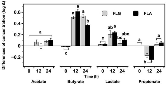 Changes in concentrations of acetate, butyrate, lactate, and propionate during in vitro fecal fermentation with FLG and FLA. The following calculation was applied: [log (acid concentration after fermentation – acid concentration at blank-treated control)]. Different lowercase letters on the bars of each acid represent significant differences according to the Tukey–Kramer honest significant difference test (p < 0.05).