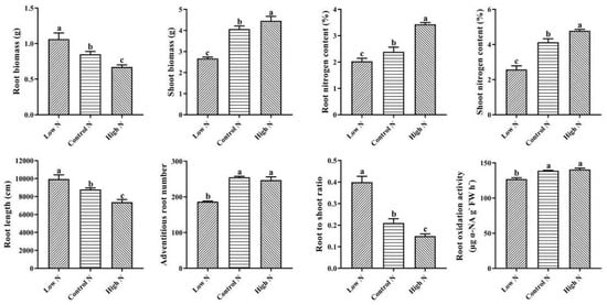 As shown in Figure 1, compared with control nitrogen, shoot biomass accumulation was inhibited by low nitrogen and promoted by high nitrogen, while root biomass accumulation was promoted by low nitrogen and inhibited by high nitrogen. Compared with control nitrogen, nitrogen deficiency had a negative effect on the root to shoot ratio, while high nitrogen increased the root to shoot ratio. The root length was significantly inhibited under high-nitrogen conditions compared with control nitrogen conditions, while root length was significantly promoted under low-nitrogen conditions. The shoot and root nitrogen content increased with increasing nitrogen supply levels. Compared with control nitrogen, low nitrogen decreased the adventitious root number and root oxidation activity, while high nitrogen had no significant effect on adventitious root number and root oxidation activity.