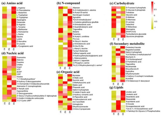 Heat map of differentially changed metabolites under low- and high-nitrogen conditions. N1, N2, and N3 indicate metabolite levels of low nitrogen, control nitrogen, and high nitrogen, respectively. (a) Amino acid; (b) N-c0mpound; (c) Carbohydrate; (d) Nucleic acid; (e) Organic acid; (f) Secondary metabolite; (g) Lipids.