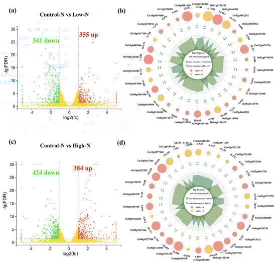 Transcriptional analysis of rice roots under low- and high-nitrogen conditions. (a) The number of DEGs and (b) top 30 DEGs under low-nitrogen conditions. (c) The number of DEGs and (d) the top 30 DEGs under high-nitrogen conditions. The top 30 DEGs were selected based on |log2FC|. −lg(FDR), −log10 (false discovery rate), FC, fold change.