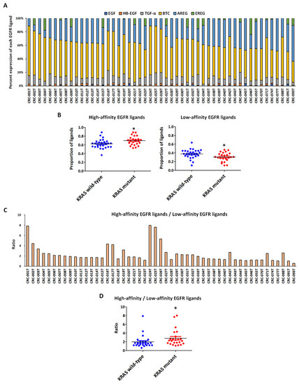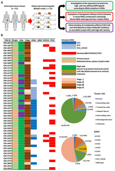 2.1. Genomic Characterization of CRC PDX Models and Expression Levels of High- and Low-Affinity EGFR Ligands According to KRAS Status