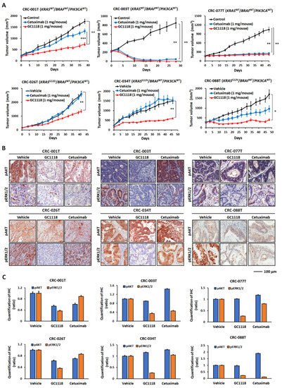 2.2. GC1118 is More Active Than Cetuximab against KRAS-Mutant CRC PDXs