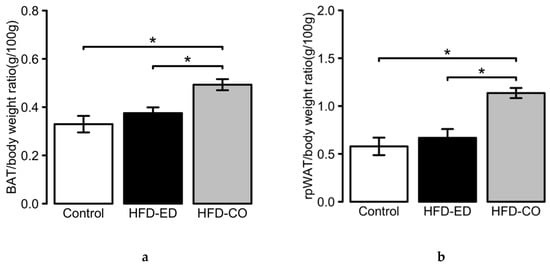 Physiological changes in adipose tissues upon dietary intervention. (a) Brown adipose tissue: Effects of 8 weeks of diet intervention on brown adipose tissue (BAT), represented as BAT to body weight ratio. (b) White adipose tissue: Effects of 8 weeks diet intervention on white adipose tissue (WAT), represented as WAT to body weight ratio. For 8 weeks dietary intervention: n = 10, 12, 12; control, high fat diet (HFD corn oil with 40% substituted with EPA and DHA (HFD-ED) and HFD-corn oil (HFD-CO), respectively. * asterisk denotes significant difference between evaluated groups by Tukey’s multiple comparison test. Data are shown as mean ± SEM and p-value < 0.05 was considered significant.