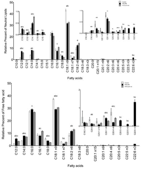WAT.Fatty acids methyl esters (FAME) composition is shown as mean ± SEM and as a relative percentage of total lipid fractions in order of increasing number of carbon-chain length of respective fatty acid. n3 and n6 denotes omega-3 and omega-6 fatty acids, respectively. White bar control, black bar HFD-ED, grey bar HFD-corn oil (top) WAT neutral lipid fractions and FAME composition, (middle) WAT free fatty acid fraction and FAME composition, (bottom) WAT phospholipid fraction and FAME composition, from the mice fed either control diet (WAT n = 7), HFD-ED (WAT n = 10) or HFD-corn oil (WAT n = 11) after 8-week dietary intervention. The significance is denoted by different letters and the statistical difference was tested by ANOVA followed by Tukey’s multiple comparison test where letter a = p-value < 0.05 between HFD-corn oil vs. control diet; b = p-value < 0.05 between HFD-ED vs. control diet; c = p-value < 0.05 between HFD-ED vs. HFD-corn oil.
