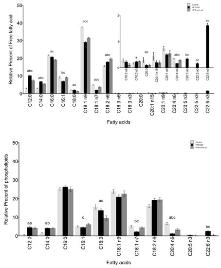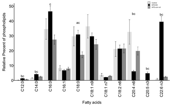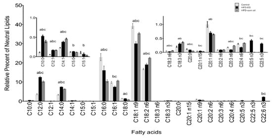 BAT.Fatty acids methyl esters (FAME) composition is shown as mean ± SEM and as a relative percentage of total lipid fractions in order of increasing number of carbon-chain length of respective fatty acid. n3 and n6 denotes omega-3 and omega-6 fatty acids, respectively. White bar control, black bar HFD-ED, grey bar HFD-corn oil (top) BAT neutral lipid fraction and FAME composition, (middle) BAT free fatty acid fraction and FAME composition, (bottom) BAT phospholipid fraction and FAME composition, from the mice fed either control diet (BAT n = 5), HFD-ED (BAT n = 8) or HFD-corn oil (BAT n = 12) after 8-week dietary intervention. The significance is denoted by different letters and the statistical difference was tested by ANOVA followed by Tukey’s multiple comparison test where letter a = p-value < 0.05 between HFD-corn oil vs. control diet; b = p-value < 0.05 between HFD-ED vs. control diet; c = p-value < 0.05 between HFD-ED vs. HFD-corn oil.