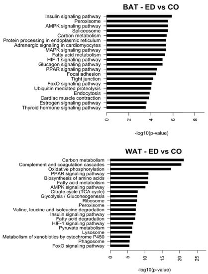 Top 20 pathways regulated in BAT for diet comparison HFD-ED vs. HFD-CO and Top 20 pathways regulated in WAT for diet comparison HFD-ED vs. HFD-CO. Pathway analysis was performed by taking all the up- and down-regulated probes into account.