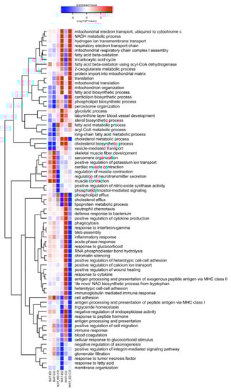 In WAT, HFD-ED up-regulated BPs related to mitochondria including electron transport chain, fatty acid β-oxidation, mitochondrial-translation, and organization, whereas, these processes were down-regulated by HFD-corn oil compared with control animals (Figure 6). Furthermore, BPs related to phospholipid- and cholesterol efflux and lipoprotein metabolic processes were strongly down-regulated by HFD-ED but up-regulated by HFD-corn oil compared with control fed mice. Immune related BPs were down-regulated in HFD-ED fed mice including inflammatory response including acute phase, antigen processing and presentation, immunoglobulin-mediated immune response, response to tumor necrosis factor, but were up-regulated in HFD-corn oil fed mice compared with control mice.