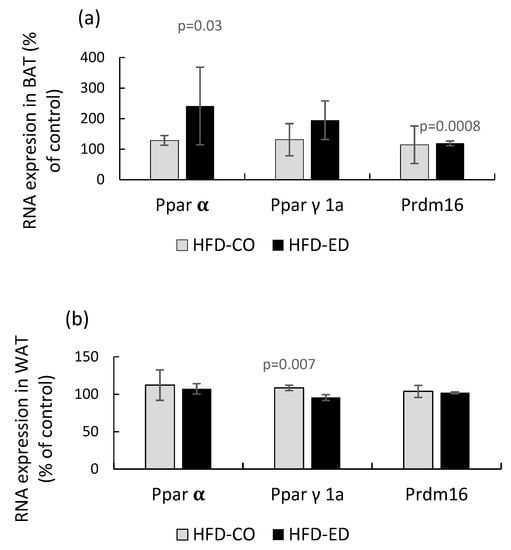 The gene expression of Ppar-α involved in β-oxidation was significantly higher in response to the HFD-ED compared to the control, such an effect was absent in the HFD-CO group, Figure 7. A small but significant effect of HFD-ED vs. the control diet on the expression of Prdm16, involved in thermogenesis, was also observed. No effect of HFD-ED or HFD-CO on Ppar-α or Prdm16 in WAT was detected. The only effect of the HFDs in WAT was a small, but significant, effect of HFD-CO on the gene Ppar γ1a involved in lipogenesis