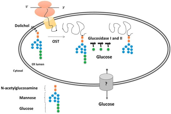 N-glycosylation has been proposed as the most important controlling process in protein folding. The oligosaccharide chain has a well-defined structure and serves as a tag for sugar-binding chaperones, called lectins. The composition of sugars defines the folding state of the maturing polypeptide and regulates its fate. The oligosaccharide moiety is synthesized in a multiple-step process on a lipid linker, dolichol-phosphate on the cytosolic face of the ER membrane. The addition of the last sugars happens in the lumen, and the assembled GlcNAc2Man9Glc3 oligosaccharide is linked to the target proteins by oligosaccharyl-transferases (OST). The editing starts with the removal of the outermost glucose by glucosidase I and II, producing free glucose in the ER lumen. The resulting sugar structure would serve as a binding site for calnexin/calreticulin and guide the polypeptide to folding cycles. The last free glucose is cleaved by glucosidase II and targets the protein to further stations of the secretory pathway [50] (Figure 2).