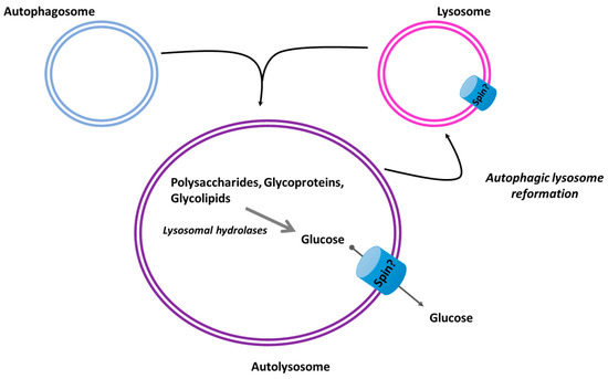 Autophagy is the cellular process for the degradation and recycling of the cellular material in certain metabolic circumstances [5]. During this pathway, autophagosomes fuse with lysosomes, where their engulfed substances are hydrolyzed by lysosomal enzymes [52]. The hydrolytic degradation of sugar-containing macromolecules, like polysaccharides, glycoproteins, and glycolipids, leads to monosaccharide formation in the lumen of autolysosomes [53]. Lysosomal membranes are equipped with lysosomal efflux transporters to translocate these nutrients to the cytosol, although these processes are not completely described [54]. Abnormal lysosomal degradation or abnormal export of degraded products can lead to the accumulation of undigested materials in the lysosomal lumen, which is also observed in many neurodegenerative diseases [55].