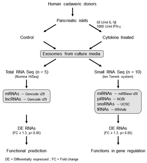 To profile protein coding and long noncoding RNAs, human islets from five cadaveric donors were obtained from the Integrated Islet Distribution Program (IIDP), and their derived exosomes were processed for total RNA sequencing. Human islets from ten donors were obtained for exosome-derived small RNA sequencing; one islet donor was common between the two sequencing protocols. Islet donor and isolation characteristics, including donor age, sex, Body Mass Index (BMI), cause of death, measurements of islet purity and viability, ischemia duration, and culture time, are provided in Supplementary Table S6, as per recent recommendations for the reporting of human islet characteristics in research articles [55]. Human islets were provided from the IIDP in a de-identified manner. The study was reviewed and approved as exempt by the Indiana University School of Medicine Institutional Review Board. Upon receipt, cadaveric islets were cultured overnight in standard Prodo medium (Prodo Labs, Aliso Viejo, CA, USA) that had been depleted for exosomes. In order to mimic the proinflammatory conditions of T1D, islets were treated with or without 50 U/mL IL-1β and 1000 U/mL IFN-γ for 24 h. After 24 h of cytokine treatment, the islet culture media was collected and centrifuged for 30 min at 3000× g to remove cellular debris. The supernatant was recovered, and exosomes were isolated using ExoQuick-TC (SBI Biosciences, Palo Alto, CA, USA), according to the manufacturer’s protocol. The overall study workflow is illustrated in Figure 1.