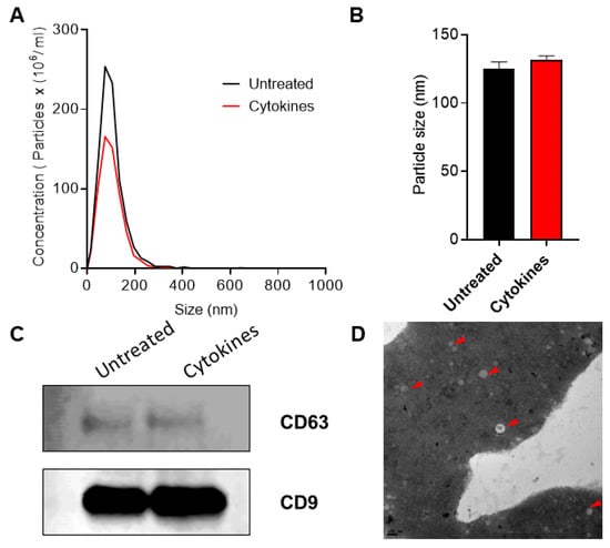 Characterization of exosomes: nanoparticle tracking analysis was performed to profile extracellular vesicle (EV) particle concentration (A) and size distribution (B) in control and human cytokine-treated islet-derived exosomes (n = 3), (C) immunoblot was performed using antibodies against CD63 and CD9, and (D) TEM imaging was performed to confirm the presence of exosomes. Shown is a representative image of exosomes from untreated islets. Representative exosomes are indicated with a red arrow. Scale bar: 100 nm.