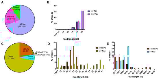 Profiling of long and small RNAs in exosomes: read distribution (A) and length distribution (B) of RNAs obtained from the total RNAseq protocol; read distribution of small RNAs (C) obtained from the small RNAseq protocol; and percentage of reads mapping to different read lengths are represented for microRNAs and piwi-interacting RNAs (D) and small nucleolar RNAs and transfer RNAs (E).
