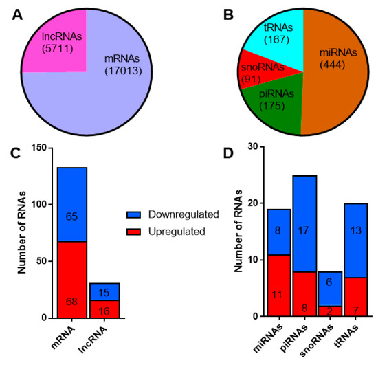 Differentially expressed long and small RNAs in exosomes: (A) the total number of long RNAs (mRNAs and long non-coding RNAs) and (B) different classes of small noncoding RNAs identified in exosomes. The number of differentially expressed (fold change ≥1.3, p < 0.05) long (C) and small RNAs (D). Shown in red are the number of upregulated long and small RNAs, while downregulated RNAs are shown in blue.