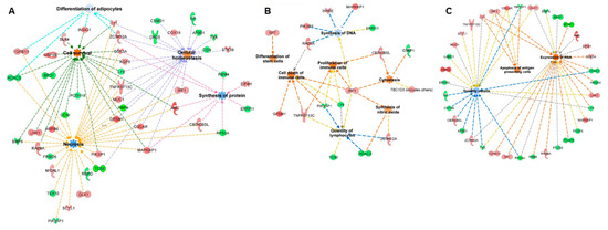 mRNA targets were predicted using the miRanda algorithm, with the focus on inverse relationship targets, i.e., if a piRNA was upregulated, the corresponding mRNA targets were identified from the group of downregulated genes and vice versa. Functions of the 25 differentially expressed piRNAs were predicted using the same workflow used to predict miRNA targets. Similar to miRNAs, 16 functional terms (exclusive of terms related to cancer) with an activation score ≥0 were identified for piRNA targets (Supplementary Table S5b). Since miRNAs and piRNAs share a similar gene regulatory mechanism by binding to the 3′UTR of mRNAs, we aimed to identify the common functions that could potentially be perturbed by both miRNAs and piRNAs. Eight functional terms were common between miRNA and piRNA targets, suggesting a possible co-regulation of the pathways by two classes of small noncoding RNAs. The common functional terms included “synthesis of proteins”, “quantity of mononuclear leukocytes”, “quantity of lymphocytes”, “differentiation of adipocytes”, “necrosis”, “cell survival”, “cell viability”, and “cellular homeostasis”. The representative common functions between miRNA and piRNA targets are illustrated in Figure 5a. Additionally, 14 and 13 functional terms were unique to miRNA and piRNA targets, respectively. The representative unique functions of miRNAs and piRNAs are illustrated in Figure 5b,c, respectively.