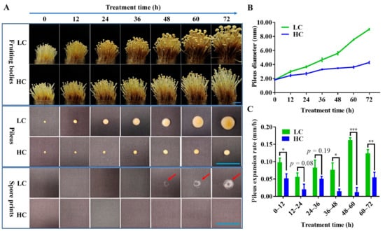Morphological comparison of fruiting bodies of Flammulina filiformis under different CO2 concentrations. (A) Morphology, pileus size, and basidiospore ejection under low (LC) and high (HC) CO2 concentrations. Red arrows indicate the spore sprints. Bar = 2 cm. (B) The effects of low and high CO2 concentrations on pileus expansion; data are the means of six replicates, and the bars represent SEMs. (C) The pileus expansion rates of each 12 h growth time; data are the means of six replicates, and the bars represent SEMs. Significant differences were analyzed using Student’s t-tests, * p < 0.05, ** p < 0.01, *** p < 0.001.
