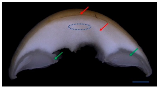 Structural presentation of F. filiformis pileus. Red arrows indicate the context, while green arrows indicate lamella. The central region of the context, shown as a dotted line oval, indicates the tissue sampling region for anatomical studies. Bar = 1 mm.